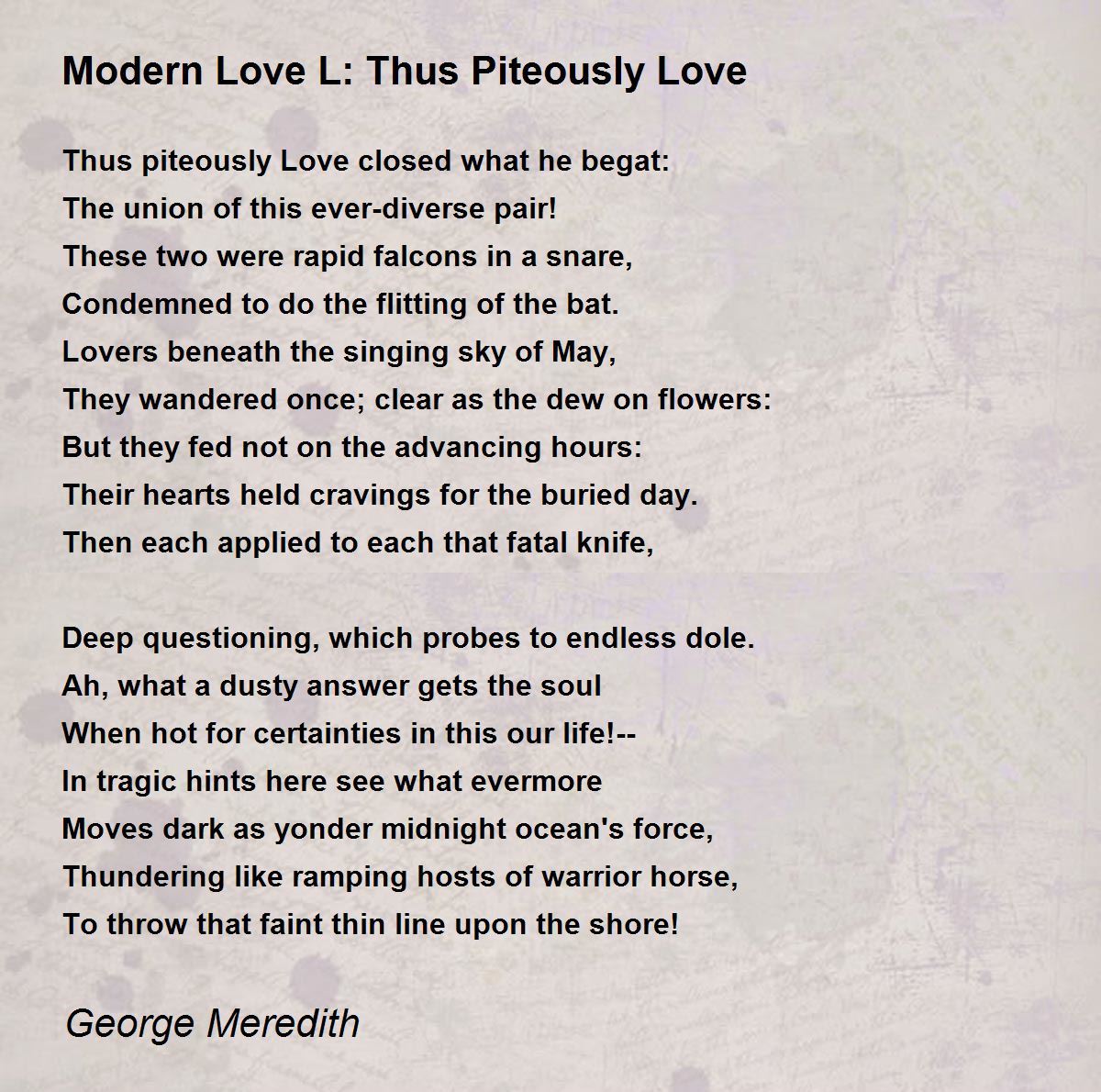 The established innovation nowadays sustain every little thing the human needs. Modern Love 1862 by George Meredith is a collection of 50 16-line sonnets about the failure of his first marriage. Payne AP Literature and Composition 14 December 2016 Modern Love Poetry Analysis Essay The poem. George Meredith OM 12 February 1828 18 May 1909 was an English novelist and poet of the Victorian eraAt first his focus was poetry influenced by John Keats among others but he gradually established a reputation as a novelist. Mosher Thomas Bird 1852-1923.